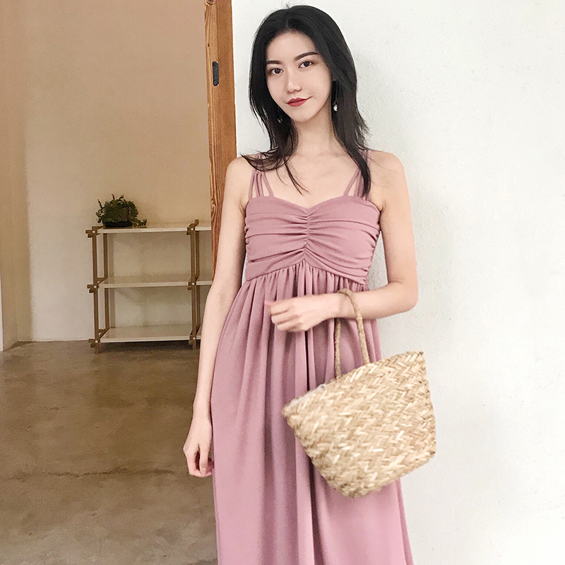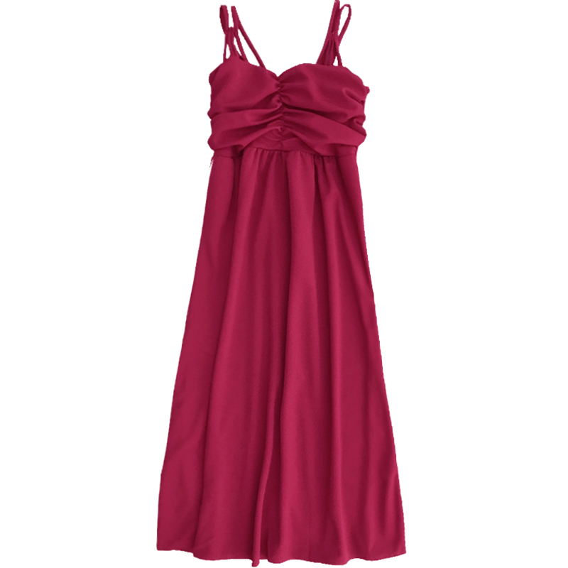 夏季新款女裝多肩帶收腰顯瘦抽褶抹胸純裙子色學生吊帶連衣裙長裙
