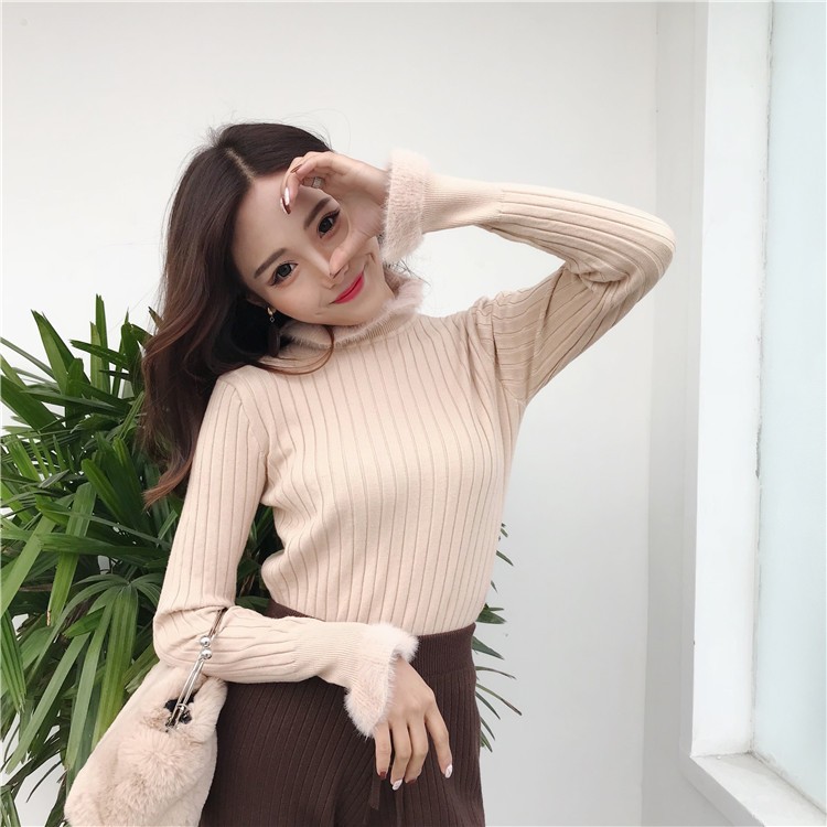 / 韓國拼接毛毛袖坑條毛衣女2018新款修身顯瘦半高領打底針織衫上衣