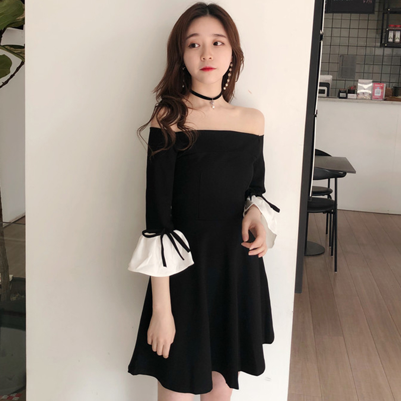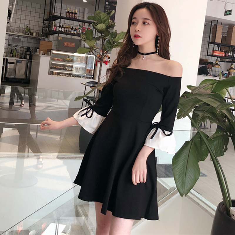 春季新款女裝韓版一字領露肩氣質黑白拼接喇叭袖學生A字連衣裙女