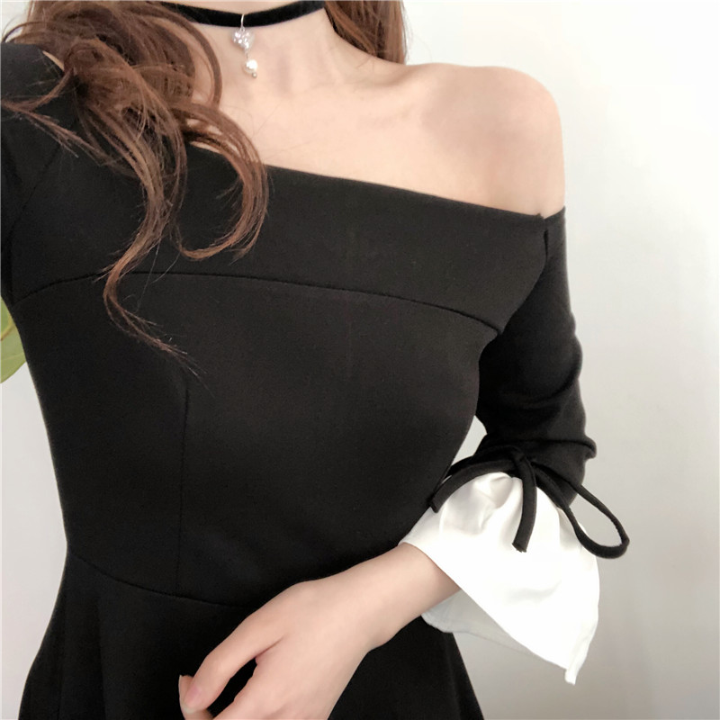 / 春季新款女裝韓版一字領露肩氣質黑白拼接喇叭袖學生A字連衣裙女