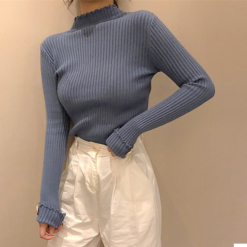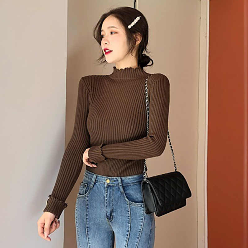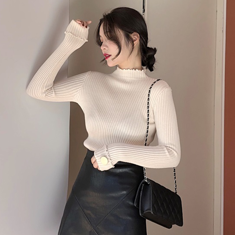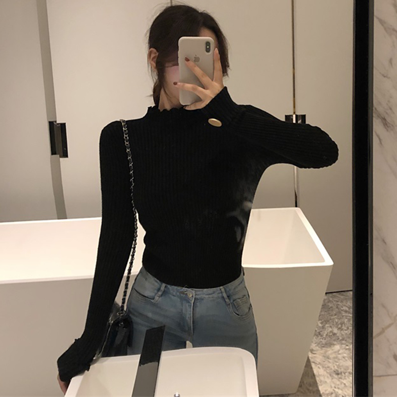 / 韓版修身顯瘦打底針織衫女秋冬裝新款半高領外穿套頭毛衣黑色上衣