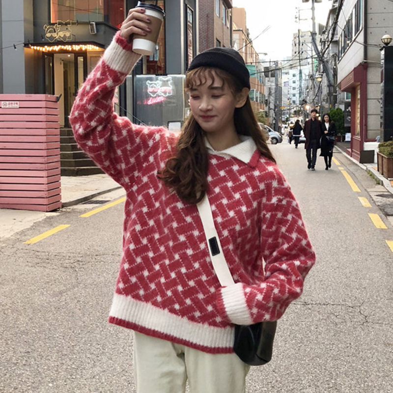 翻領慵懶毛衣女秋冬裝2018新款學生復古格紋針織外套休閑長袖上衣