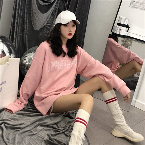 秋裝女2018新款時尚網紅同款印花圓領百搭oversize簡約長袖衛衣潮