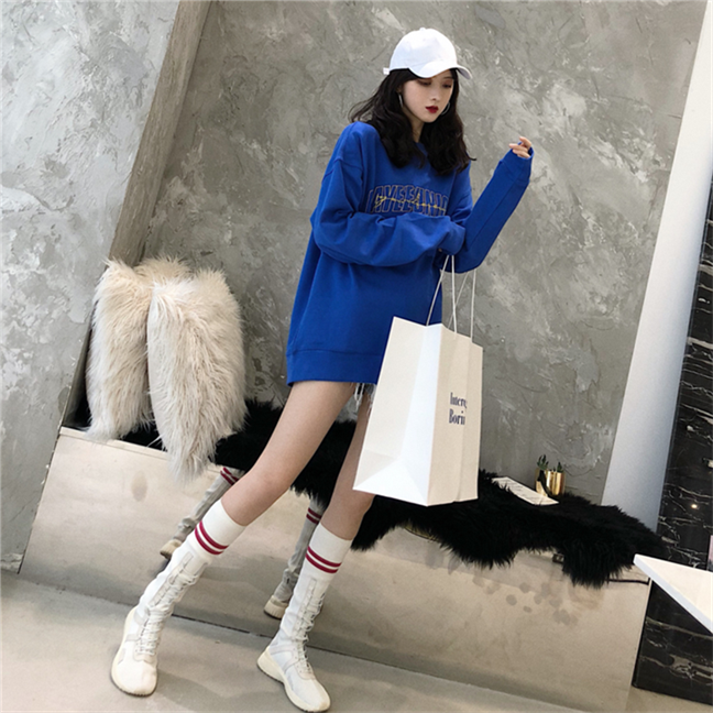 衛衣2018新款女長袖韓版寬松顯瘦oversize印花半高領慵懶長款裙子