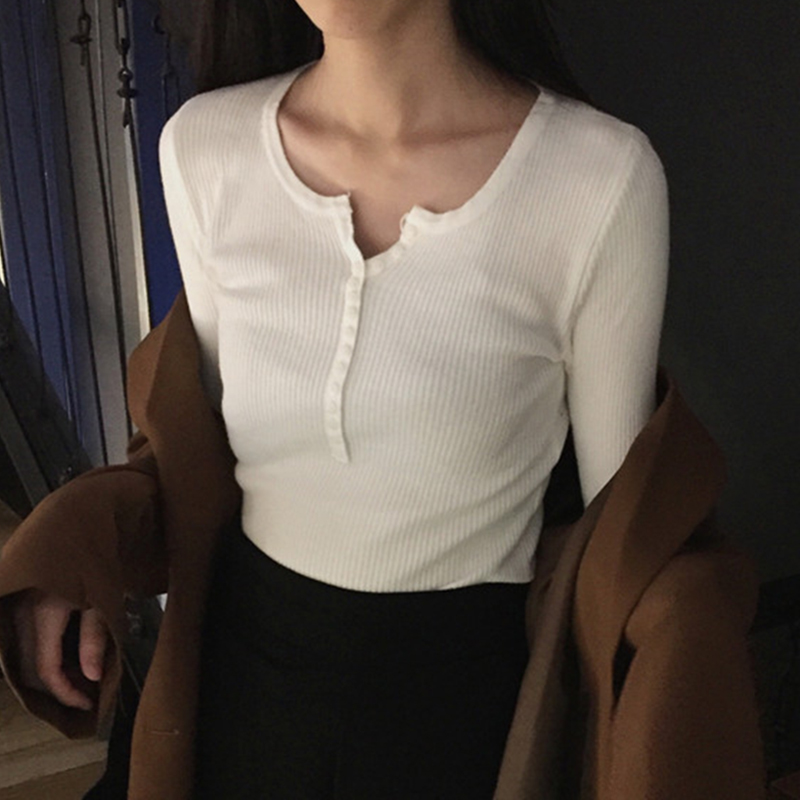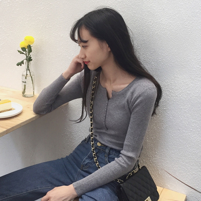 秋季新款女裝韓版包芯紗紐扣針織衫修身氣質顯瘦純色長袖打底上衣
