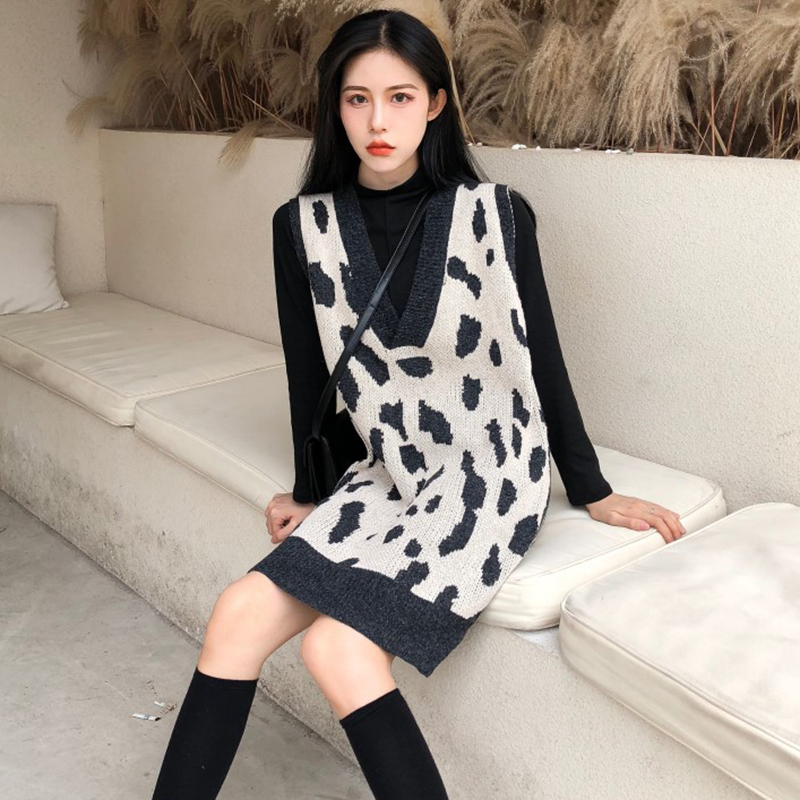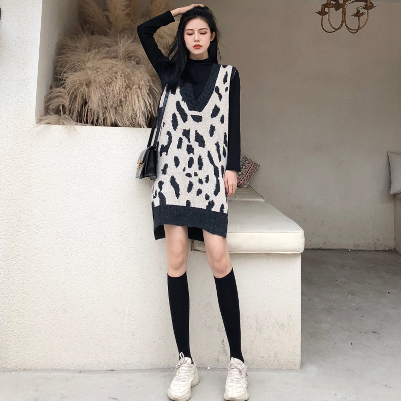 御姐套裝女秋冬新款V領豹紋針織馬甲外套修身黑色長袖T恤打底上衣