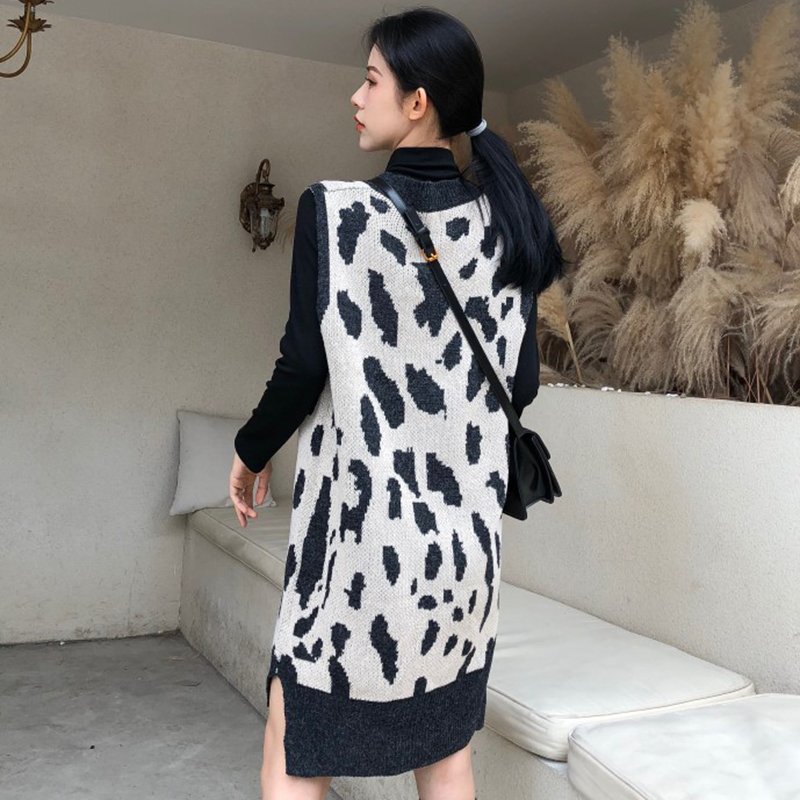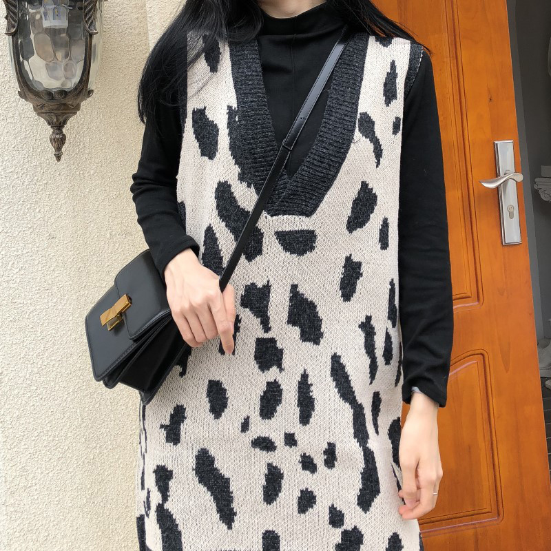 / 御姐套裝女秋冬新款V領豹紋針織馬甲外套修身黑色長袖T恤打底上衣