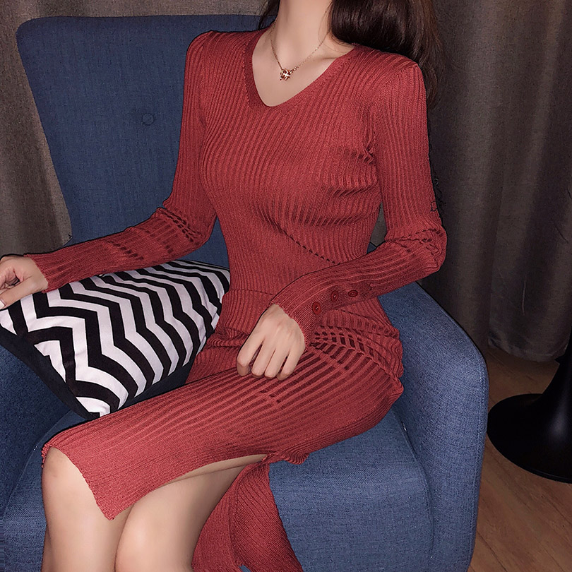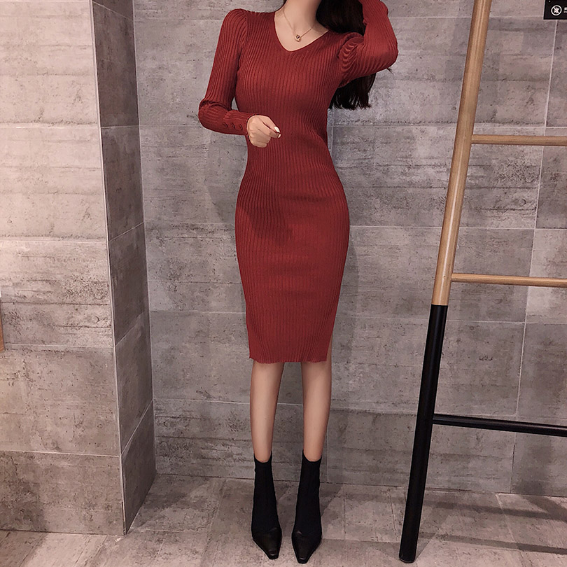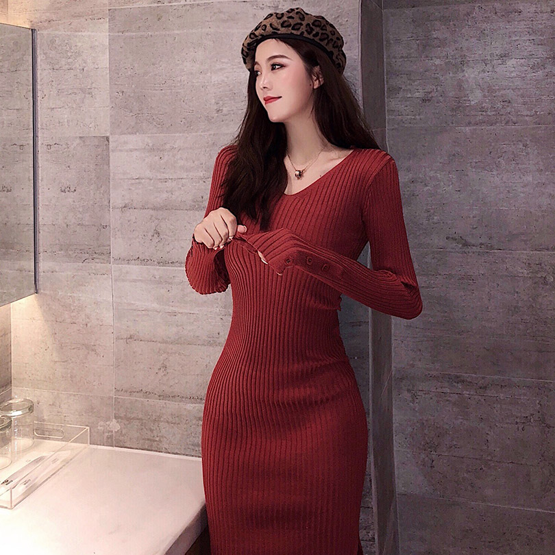 chic秋冬裙子女慵懶風款緊身修身打底長袖圓領顯瘦性感包臀中長裙