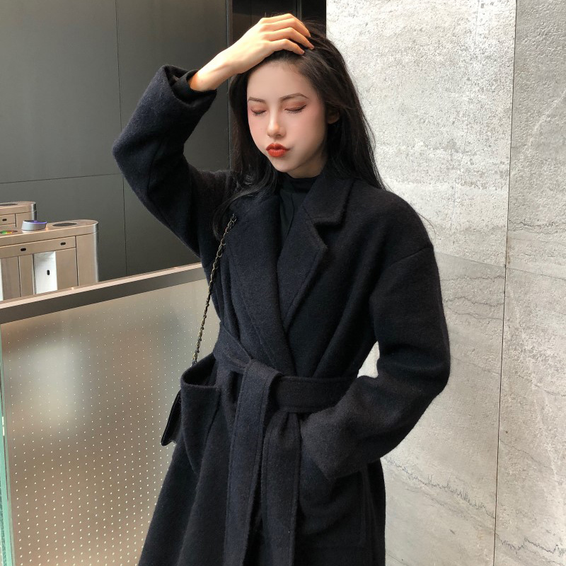 復古純色中長款毛呢外套秋冬女裝2018新款系帶收腰呢大衣長袖上衣