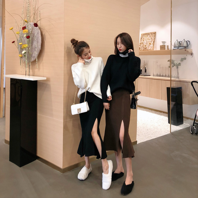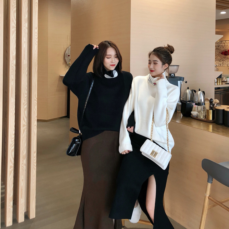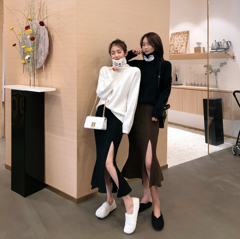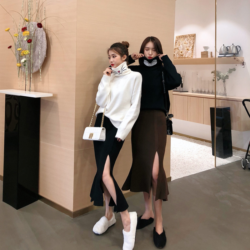 搞怪貓咪刺繡高領針織毛衣女秋冬2018新款打底衫+開叉半身魚尾裙