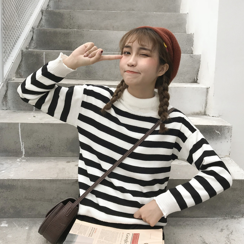 秋冬女裝2018新款韓版百搭套頭長袖針織衫學生寬松條紋毛衣外套潮