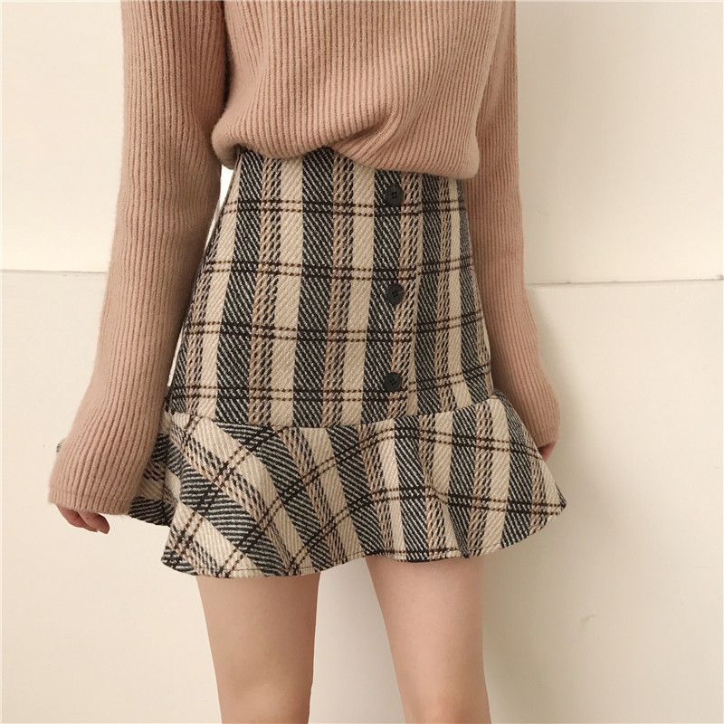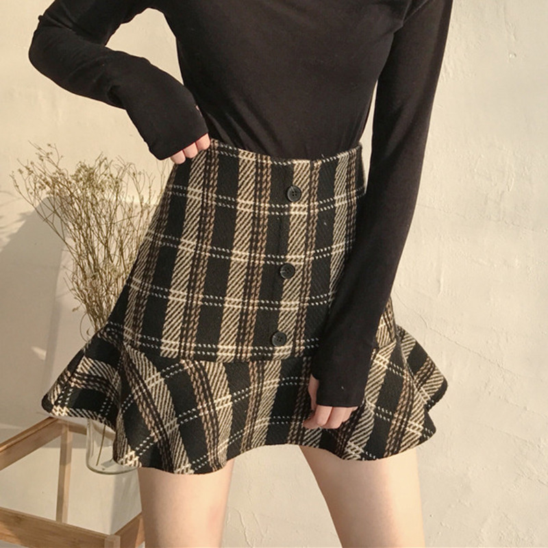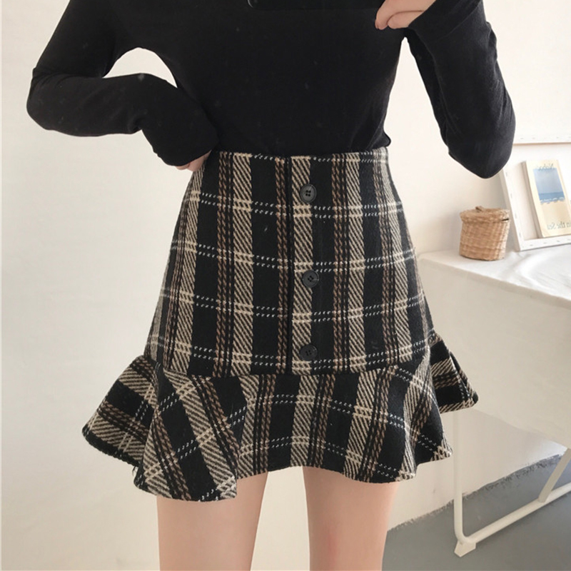 / 高腰格子毛呢半身裙女秋裝2018新款修身顯瘦a字包臀裙學生魚尾裙