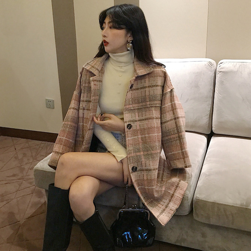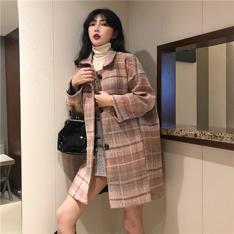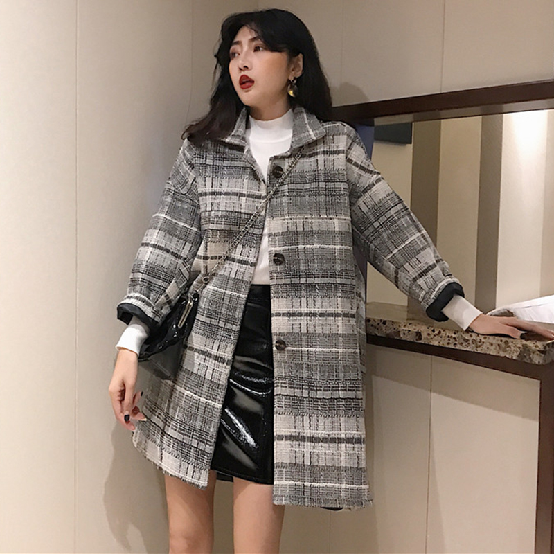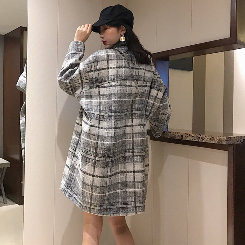 chic風流行呢子大衣女秋冬裝2018新款韓版寬松單排扣格子毛呢外套