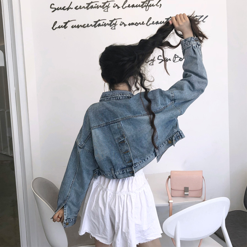 港風怪味少女短款長袖顯瘦牛仔外套女春秋時尚百搭韓版牛仔衣夾克