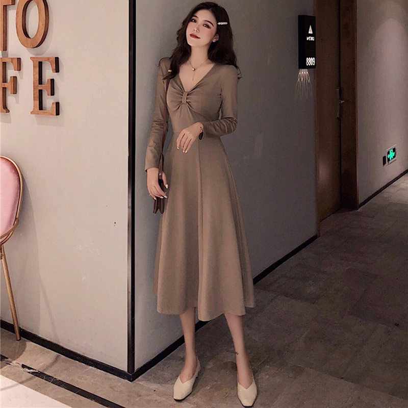 / 法式少女修身顯瘦針織連衣裙子秋冬裝新款氣質V領egg風A字桔梗裙