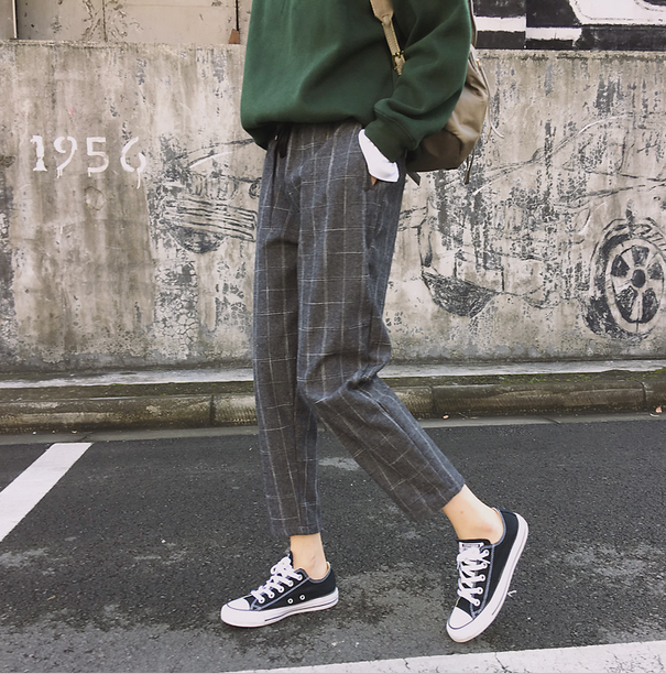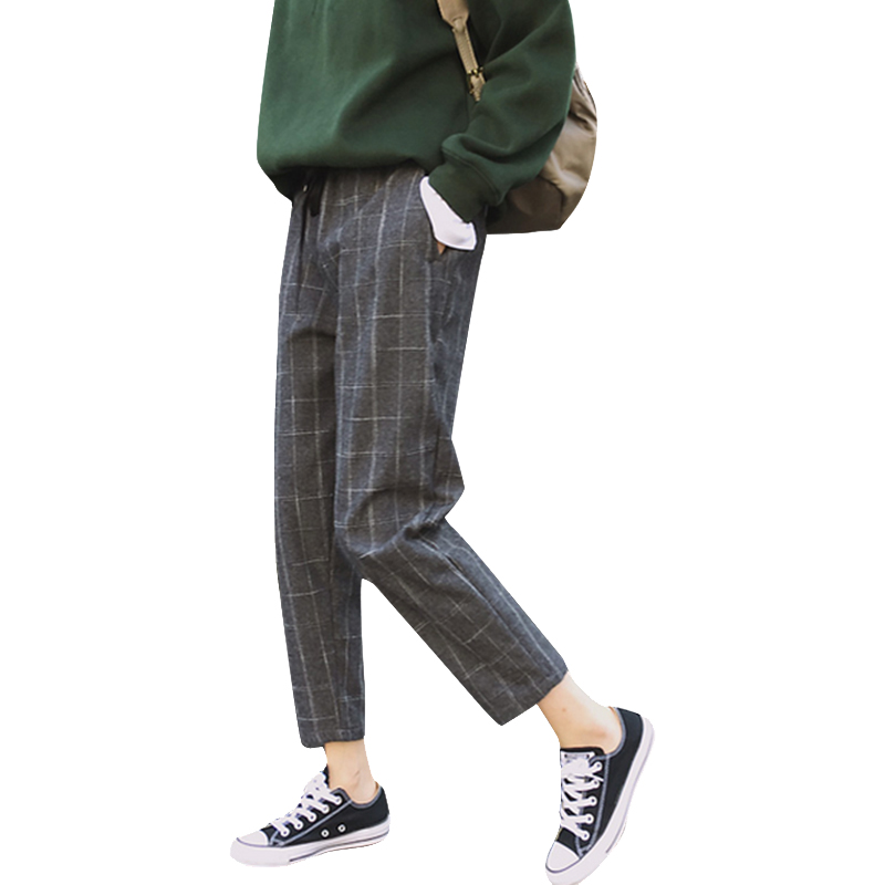 / 早春新款女裝學院風格子抽繩松緊腰寬松顯瘦百搭哈倫褲九分休閑褲