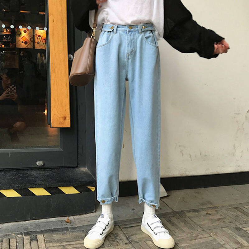 / 秋裝女新款韓版簡約休閑哈倫褲高腰淺色牛仔褲學生寬松九分褲子潮
