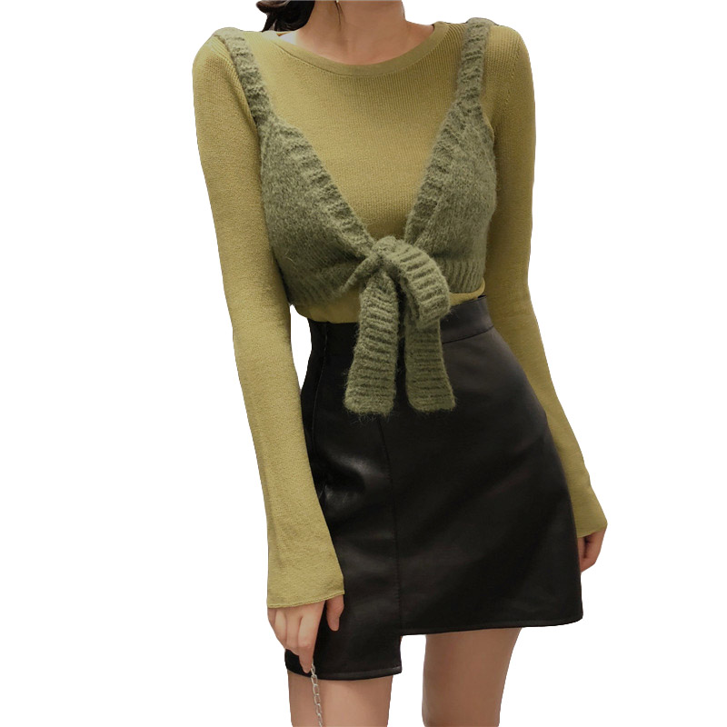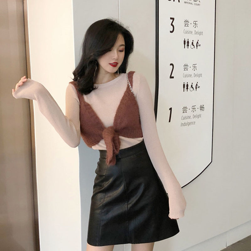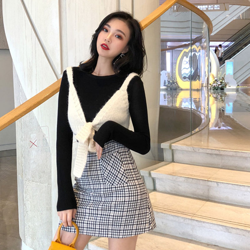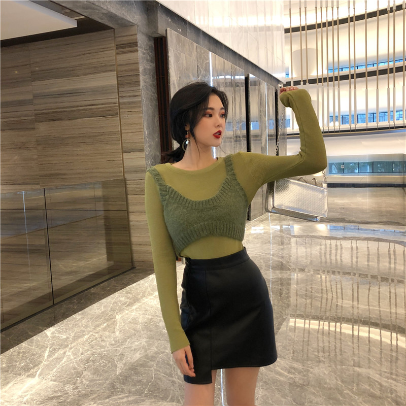 女神套裝秋裝2018新款圓領套頭長袖純色打底衫上衣+針織吊帶馬甲