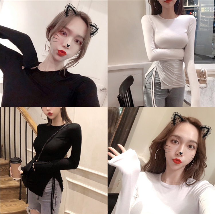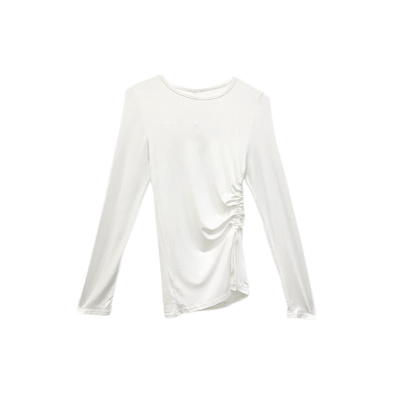 / 韓版時尚百搭秋天上衣女純色簡約圓領長袖抽繩修身顯瘦T恤打底衫