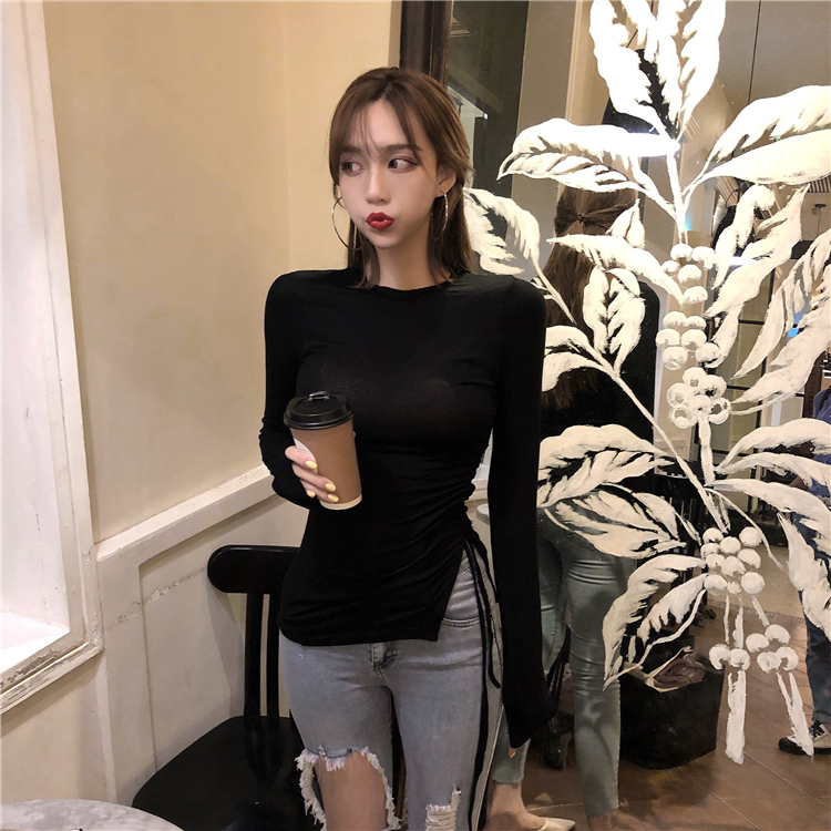 韓版時尚百搭秋天上衣女純色簡約圓領長袖抽繩修身顯瘦T恤打底衫