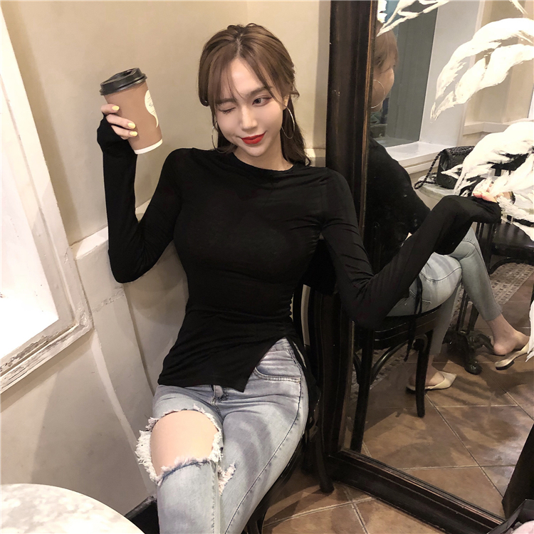 初秋新款女上衣韓版時尚chic基礎款百搭顯瘦高領純色打底衫t恤女