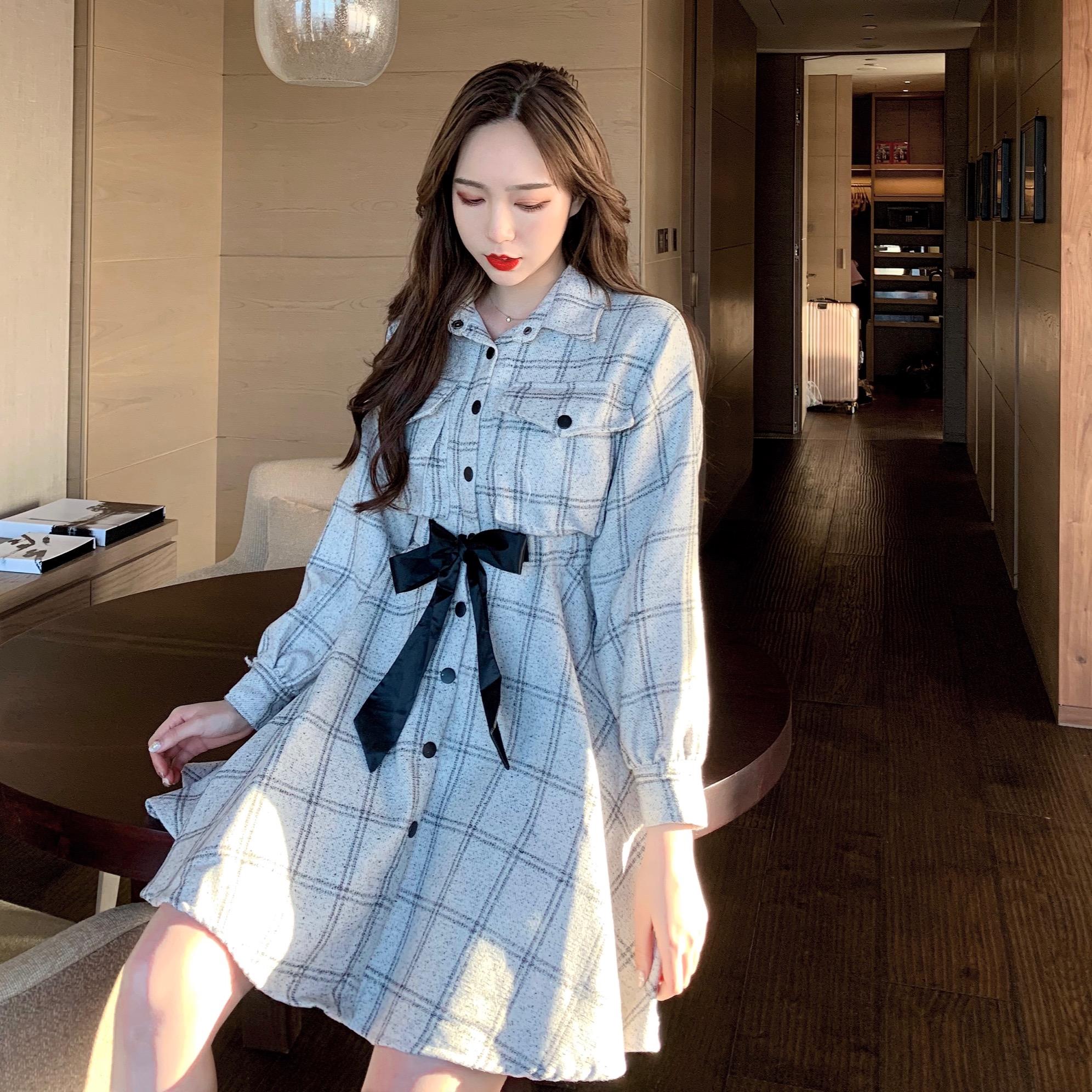 / 港味裙子女秋冬2018新款氣質翻領格子松緊腰修身長袖呢子連衣裙女