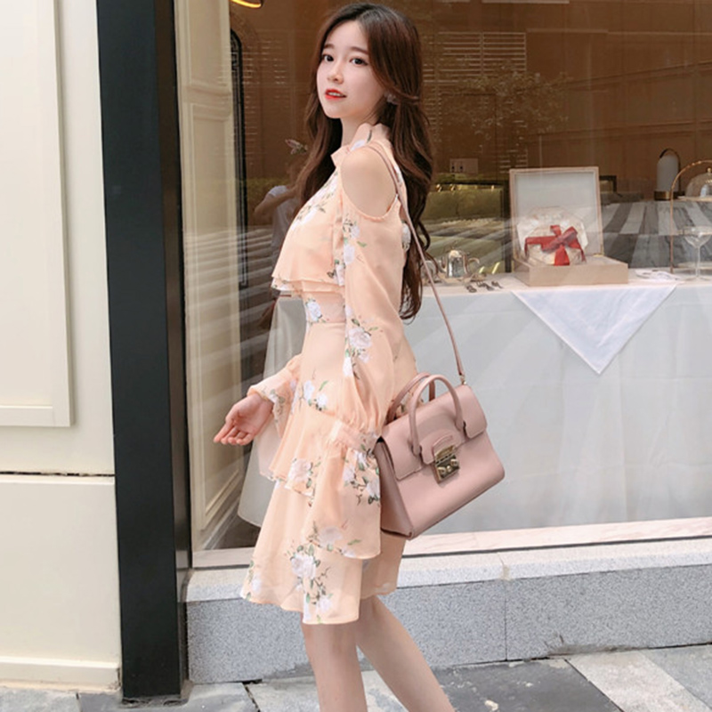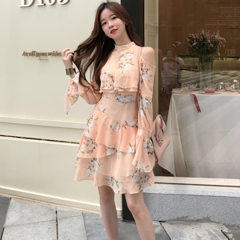 女秋裝2018新款 超仙連衣裙 初戀碎花裙復古長袖露肩荷葉連衣裙子