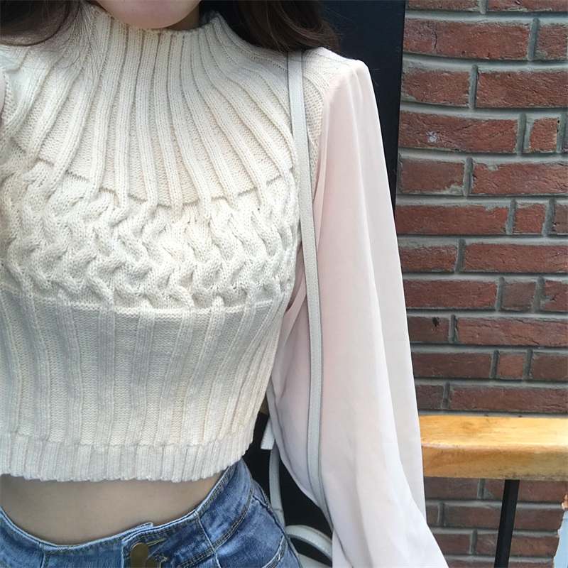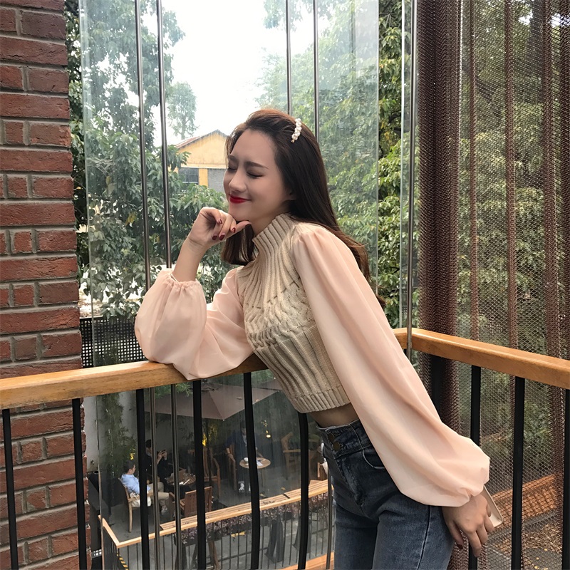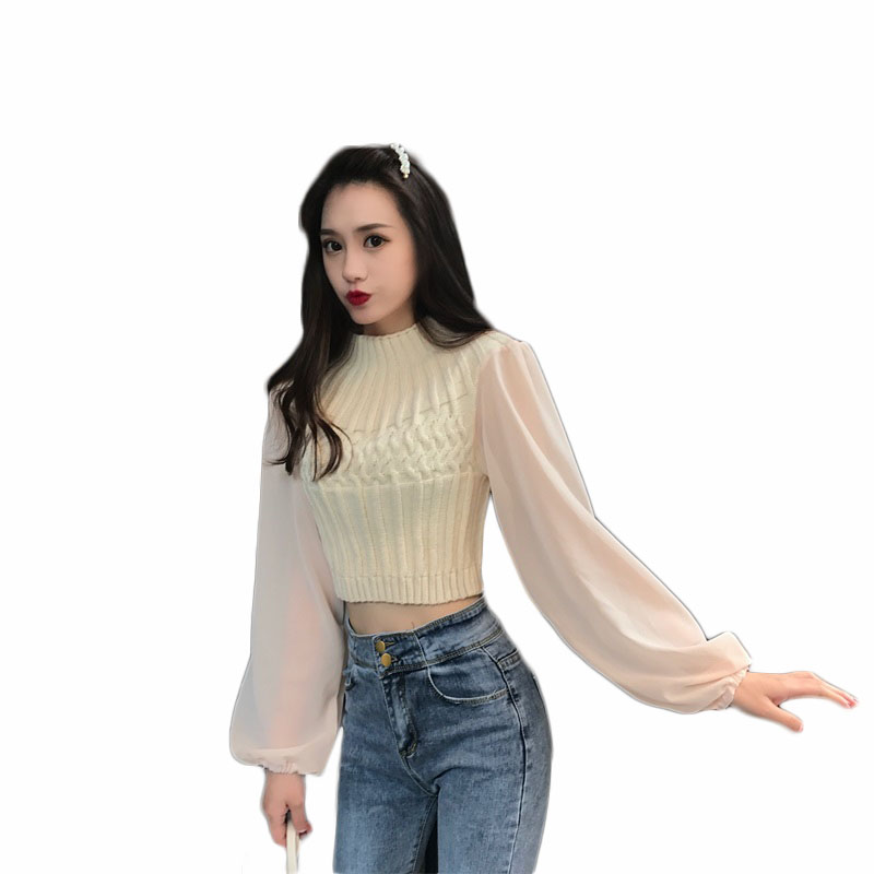毛衣女秋冬2018新款短款雪紡燈籠長袖拼接針織衫氣質百搭打底衫潮