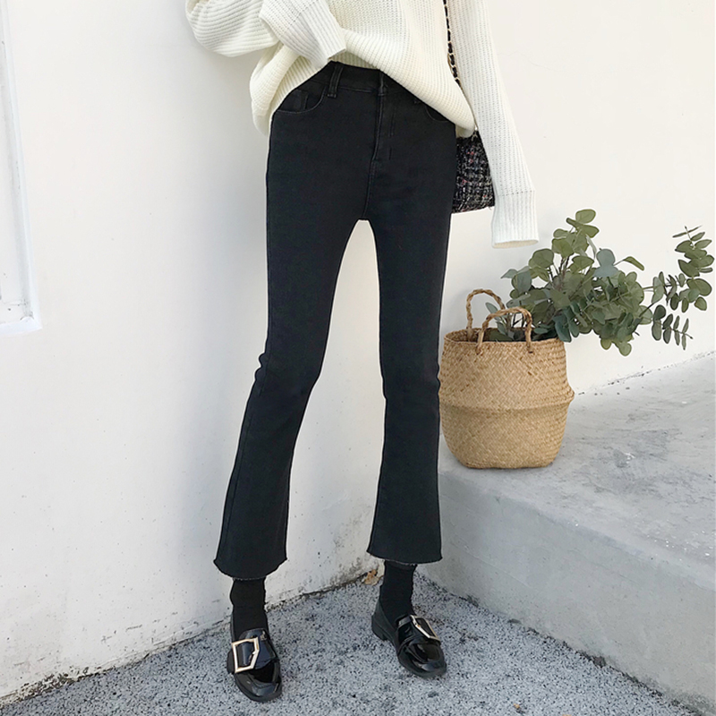 / 高腰顯瘦毛邊喇叭牛仔褲女秋冬裝新款復古風加絨黑色休閑八分褲子