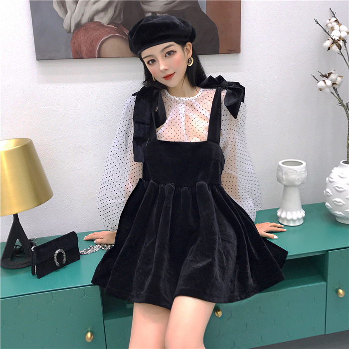 / 秋裝女2018新款套裝韓版波點長袖罩衫女+蝴蝶結絲絨吊帶裙兩件套