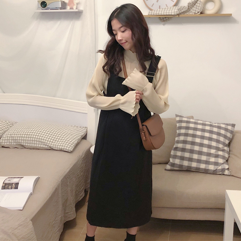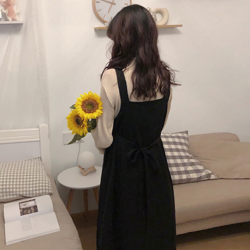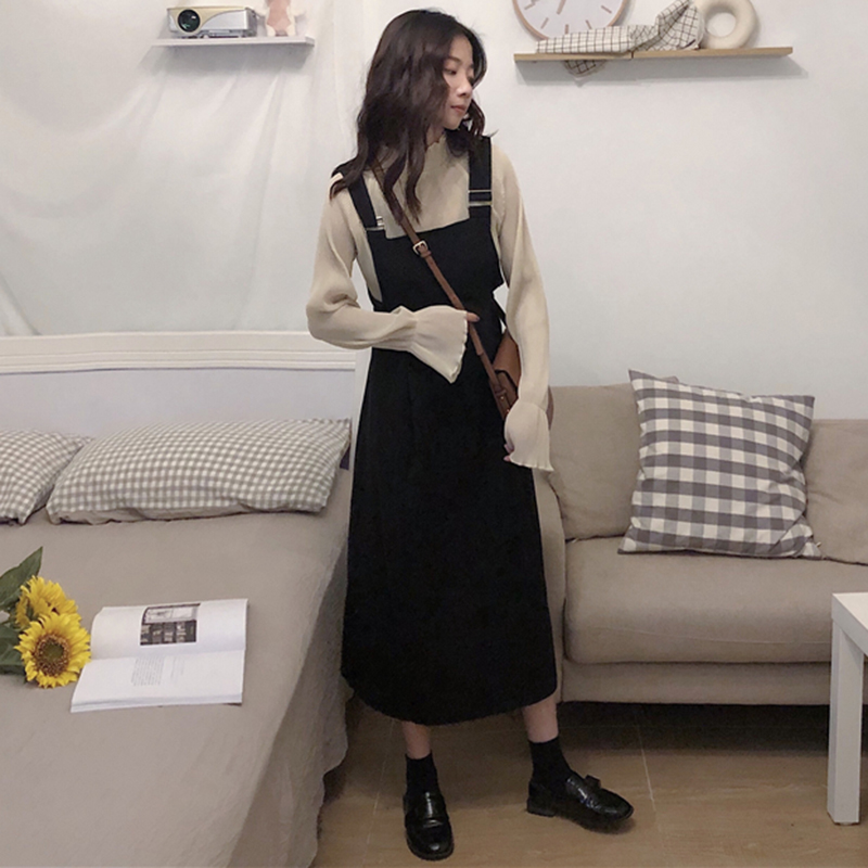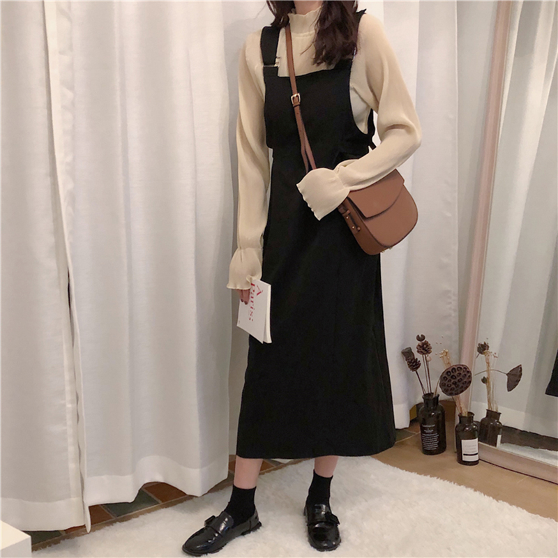 黑色背帶連衣裙|杏色雪紡衫