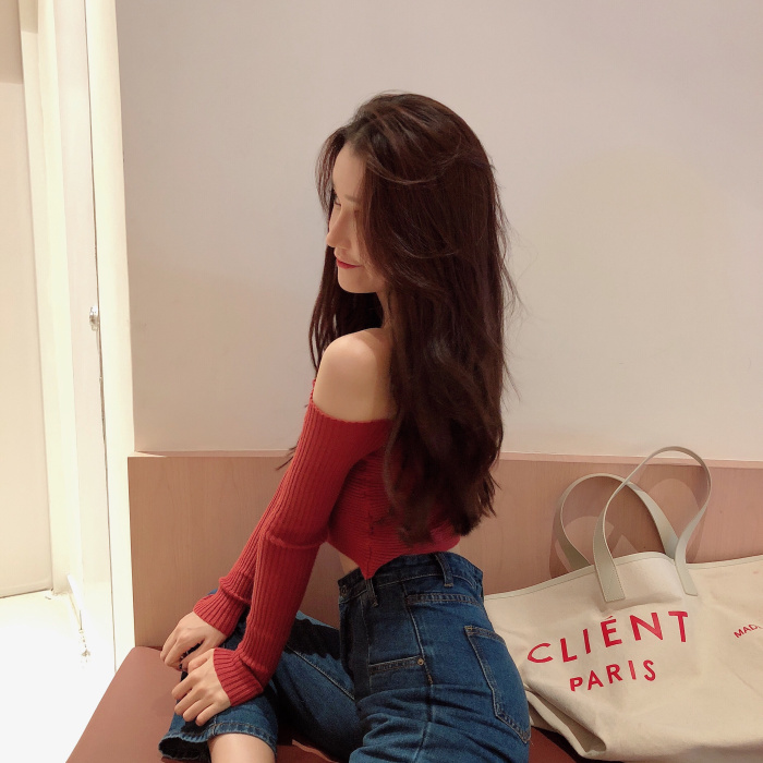 韓版時尚秋裝女2018新款百搭露斜肩漏鎖骨針織衫短款小心機上衣潮
