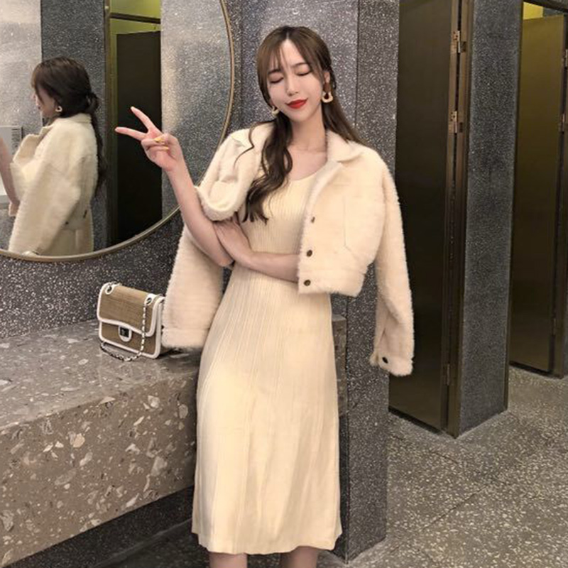 毛衣加裙子兩件套秋裝2018新款寬松短款毛絨外套休閑背心針織長裙