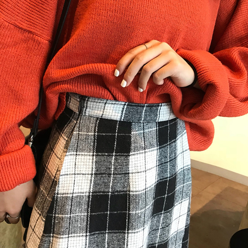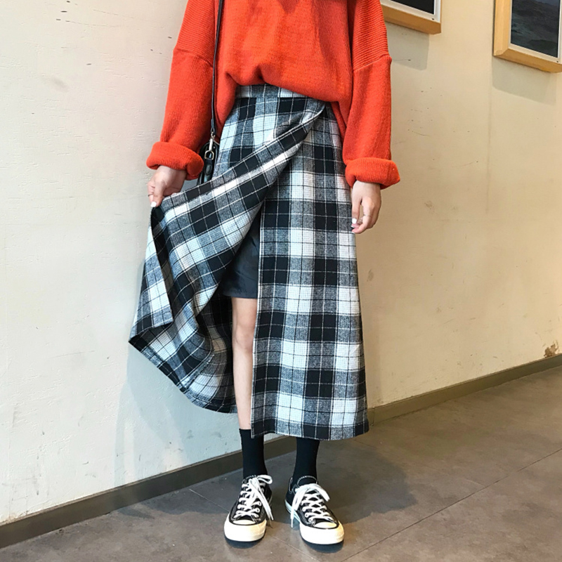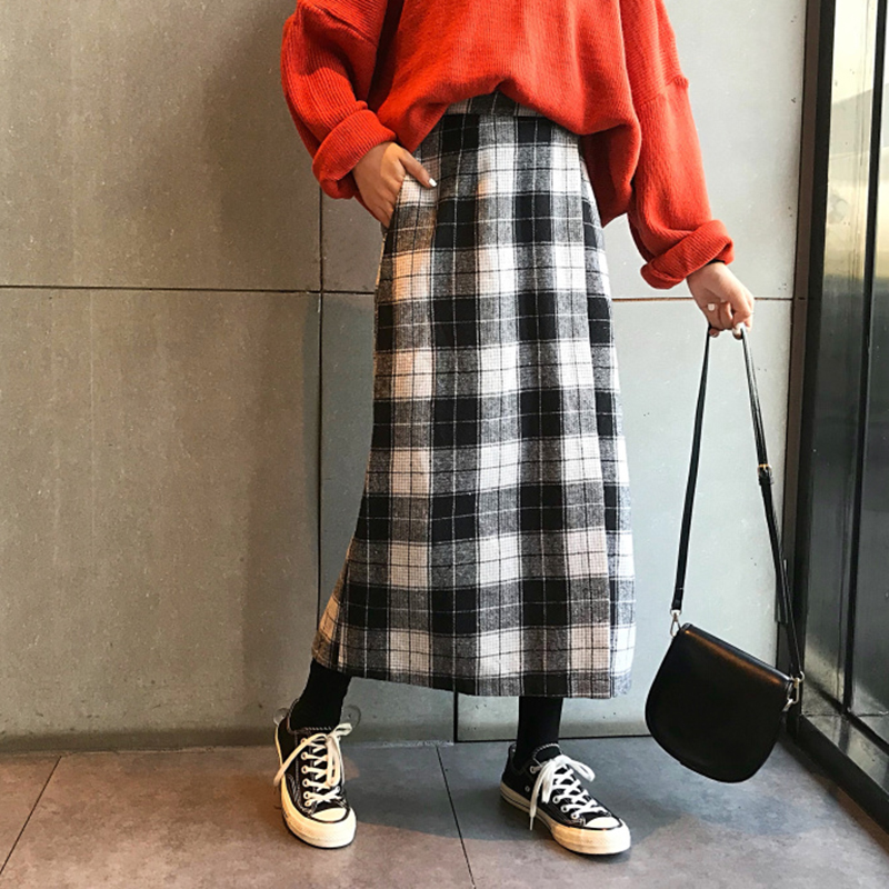 秋冬新款呢子半身裙港味復古格子a字中長裙女裝一片式高腰包臀裙