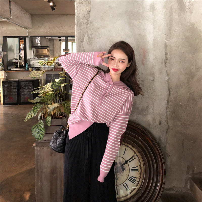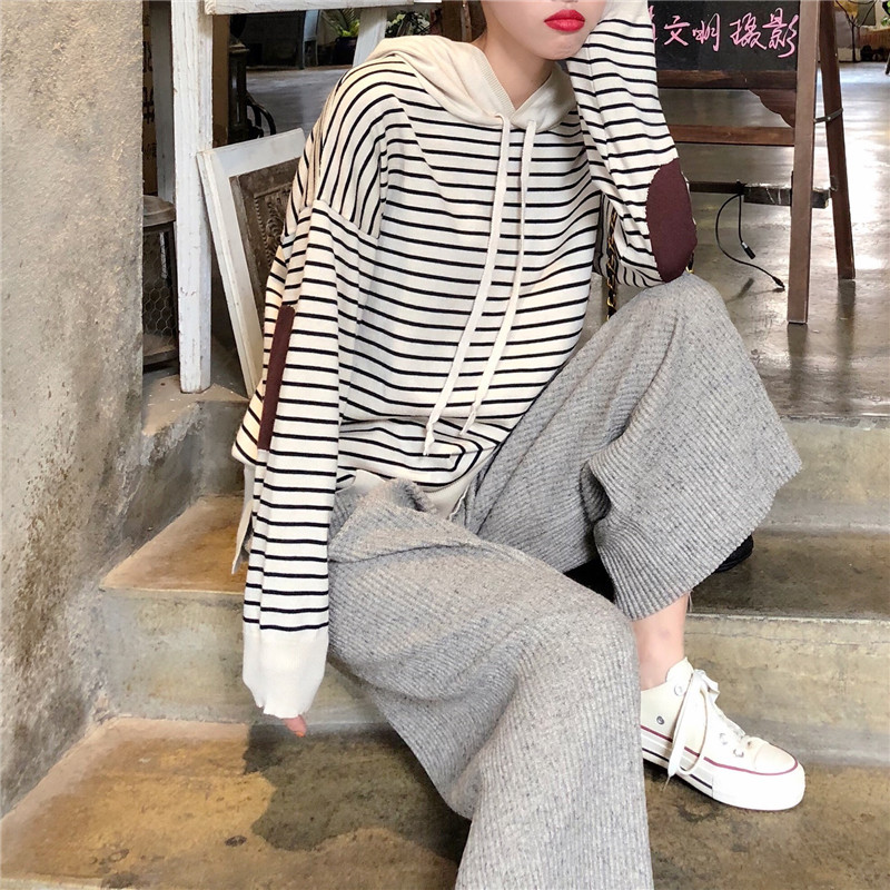 / 秋裝女2018新款軟糯連帽條紋毛衣女+慵懶風舒適闊腿褲(加厚版)