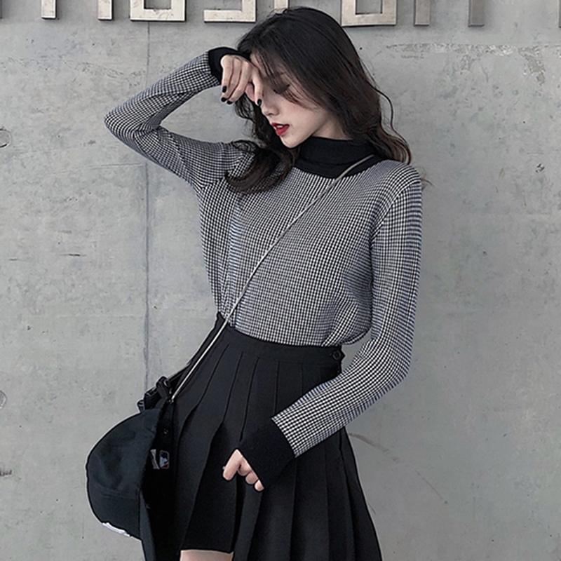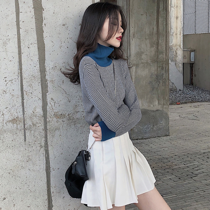 chic港味拼接高領格子針織衫女秋冬裝2018新款韓版短款打底薄毛衣