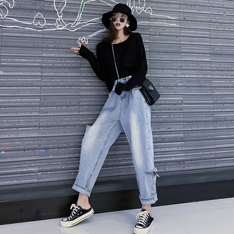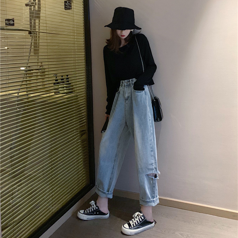 高腰個性破洞闊腿褲女秋冬裝2018新款韓版學生寬松顯瘦牛仔長褲子