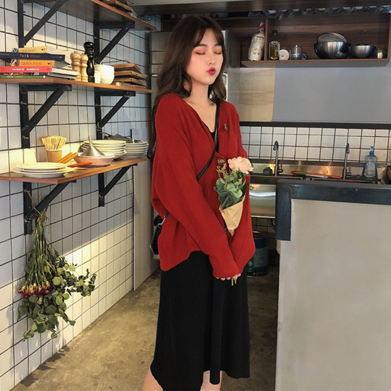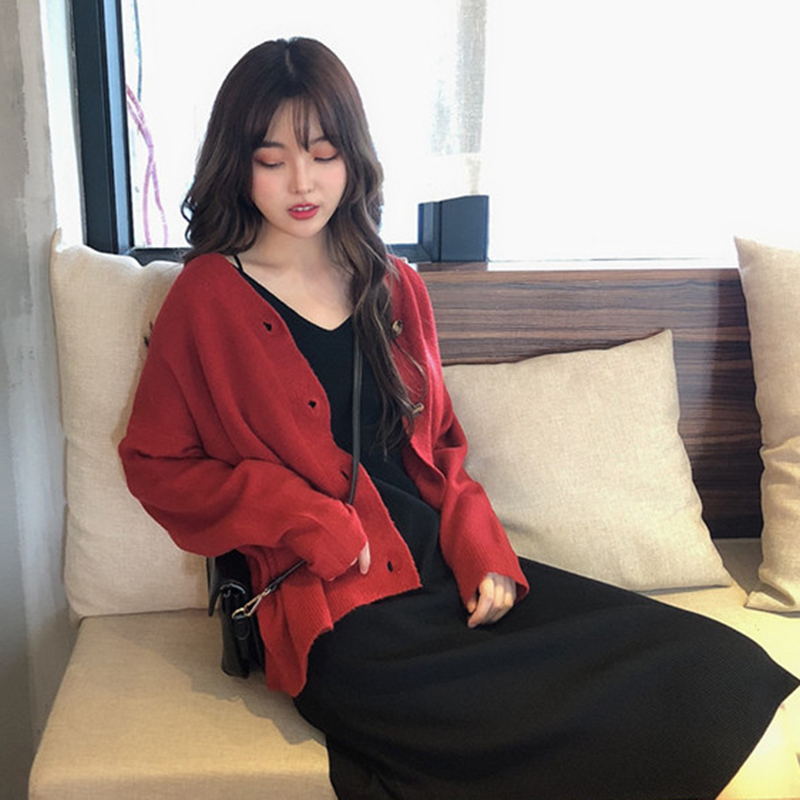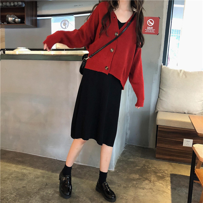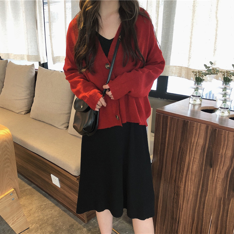 / 秋裝新款寬松V領針織開衫短外套+內搭吊帶背心連衣裙時尚兩件套女