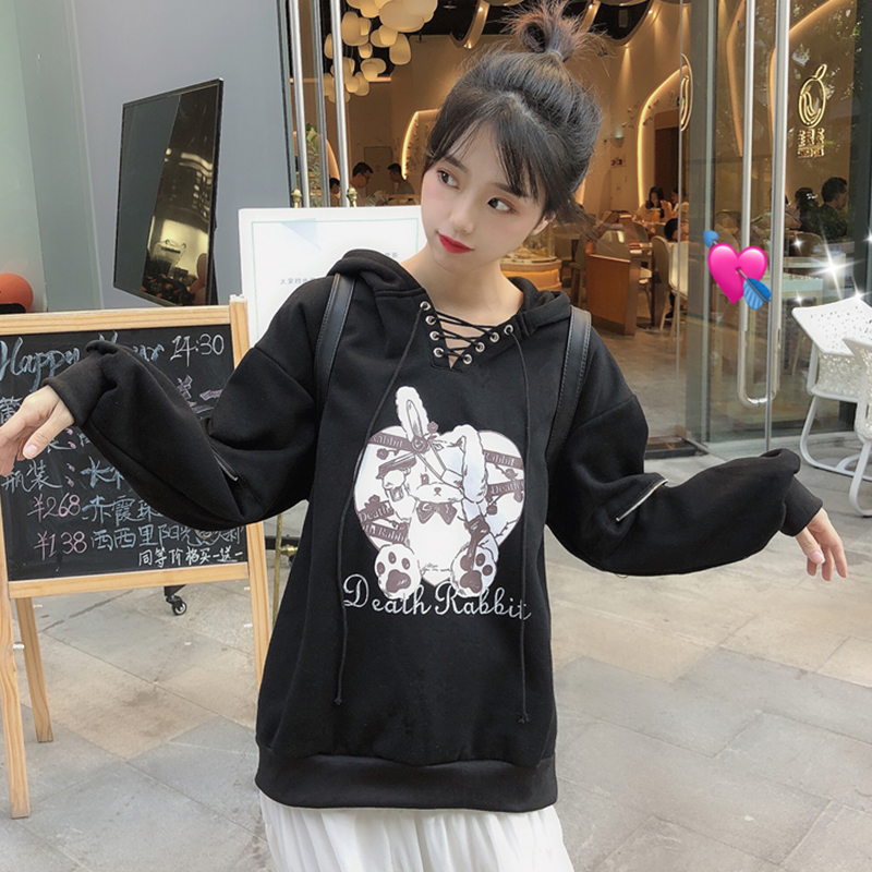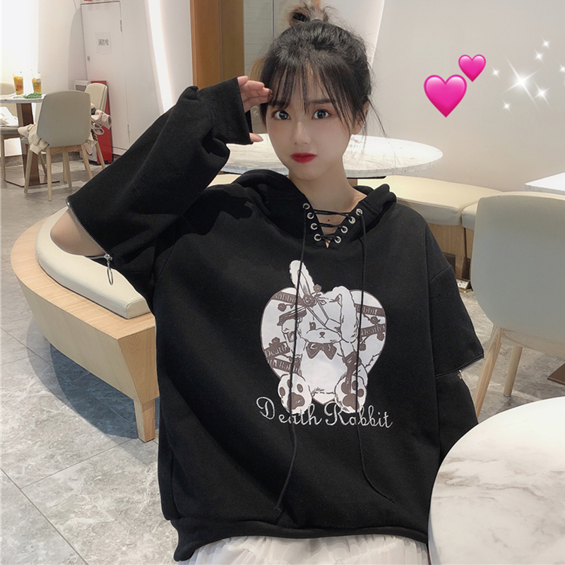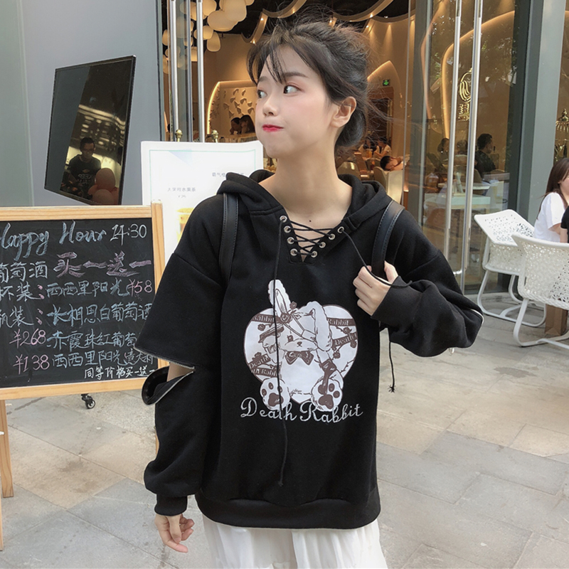 秋冬女裝2018新款V領系帶連帽圖案衛衣學生寬松個性拉鏈長袖外套