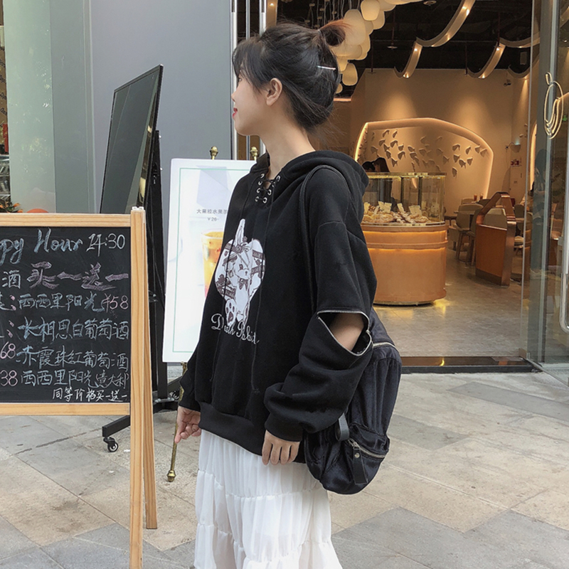 / 秋冬女裝2018新款V領系帶連帽圖案衛衣學生寬松個性拉鏈長袖外套