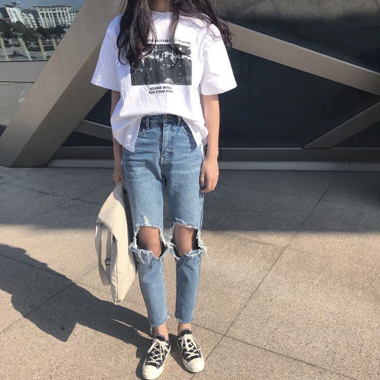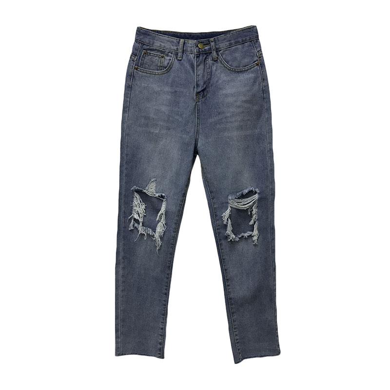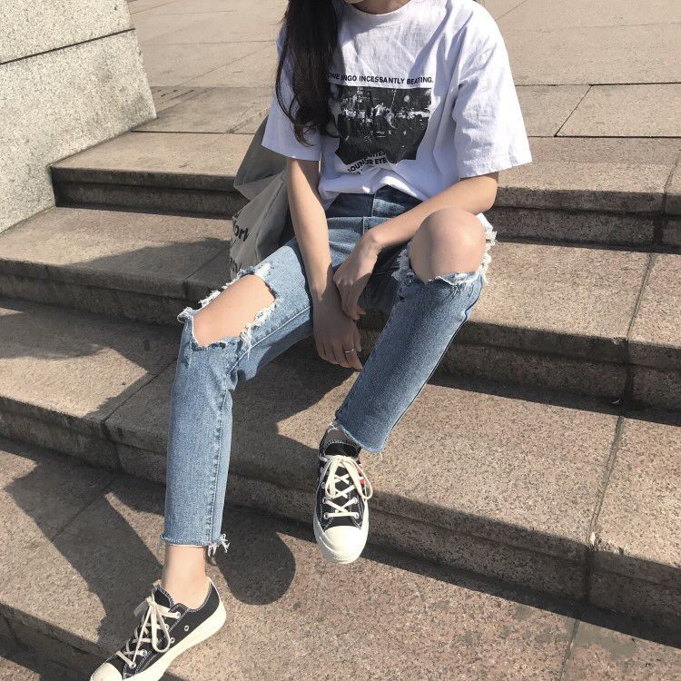 / 秋季新款復古港味個性膝蓋大破洞直筒褲氣質水洗牛仔顯瘦九分褲子