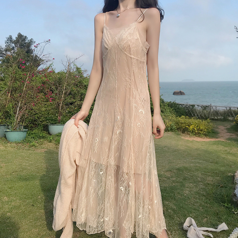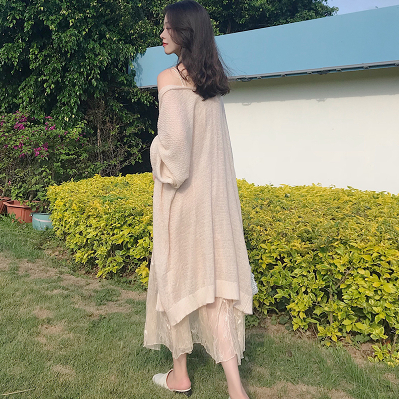 套裝女夏季新款韓版女裝中長款蕾絲吊帶連衣裙+薄款防曬針織開衫