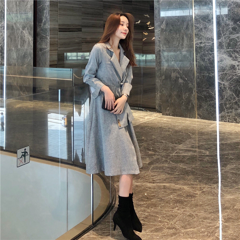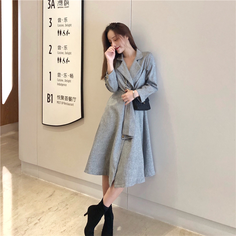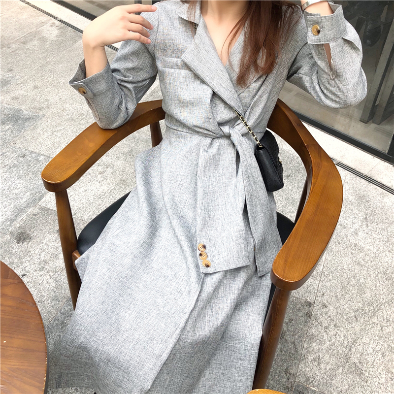 / 2018新款高級灰設計感扭結系帶假袖子大翻領時尚氣質大擺風衣外套