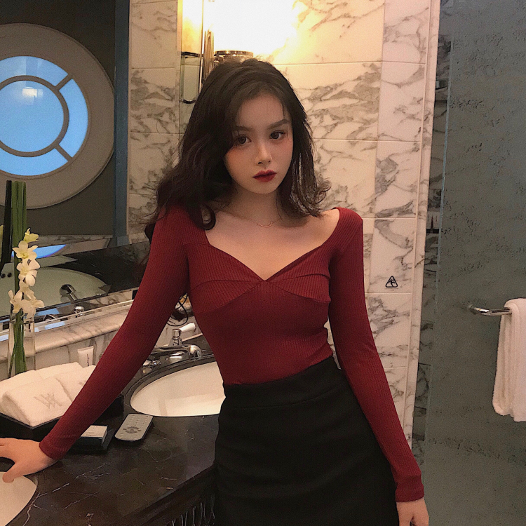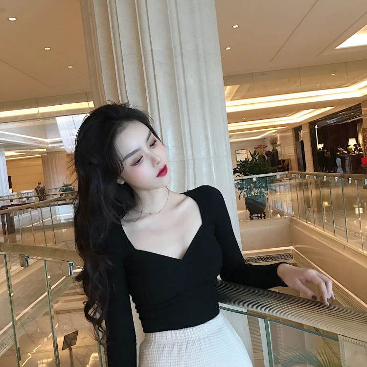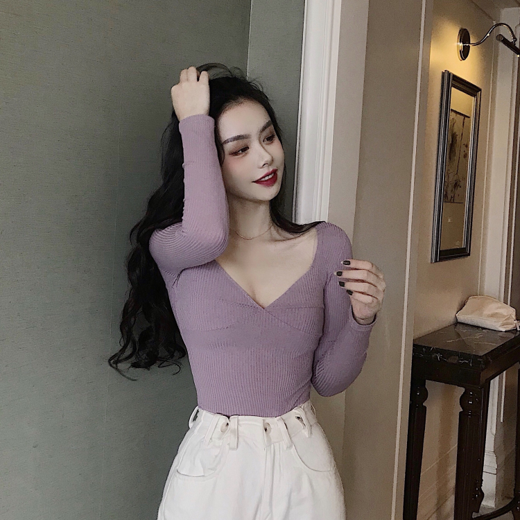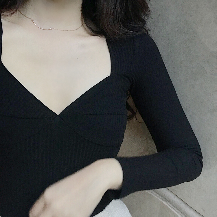 秋天上衣女時尚韓版深V領性感純色長袖T恤修身顯瘦打底長袖T恤潮