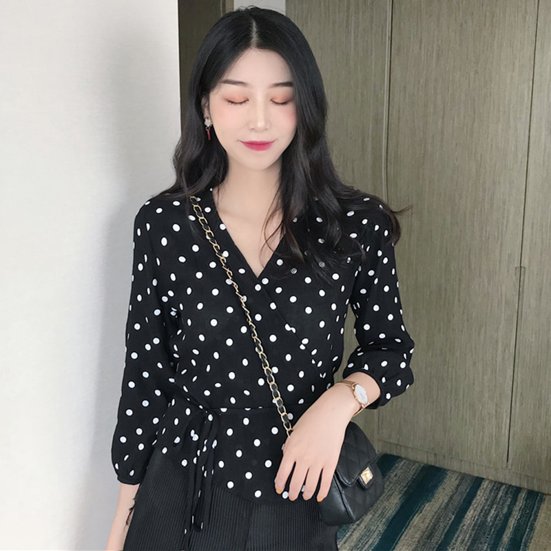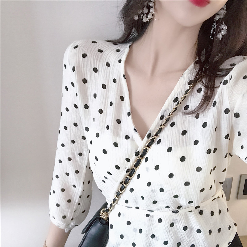 / 襯衣女夏季新款韓版女裝交叉v領七分袖波點襯衫系帶修身顯瘦上衣