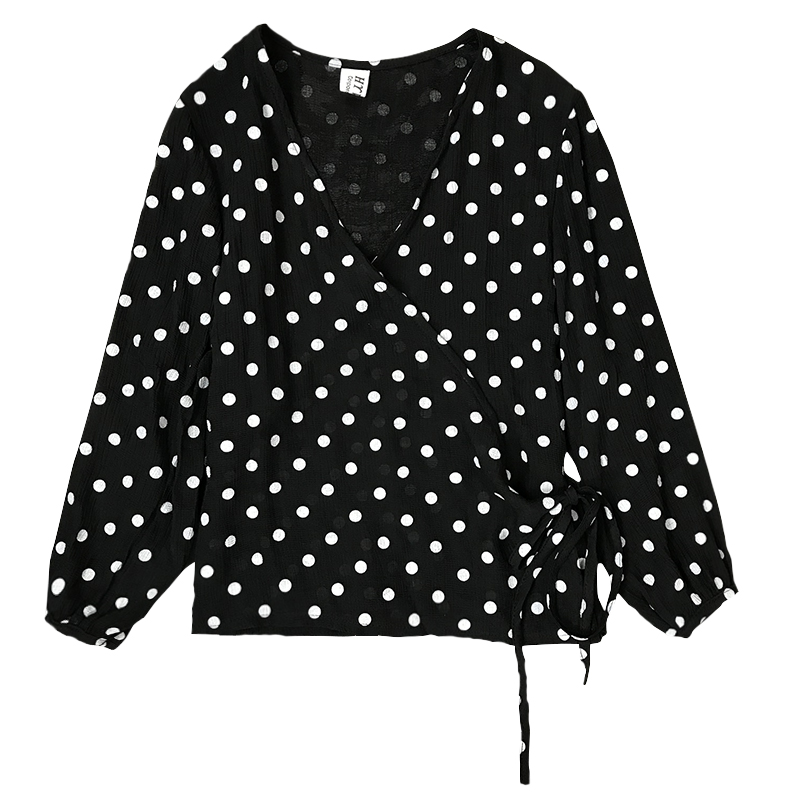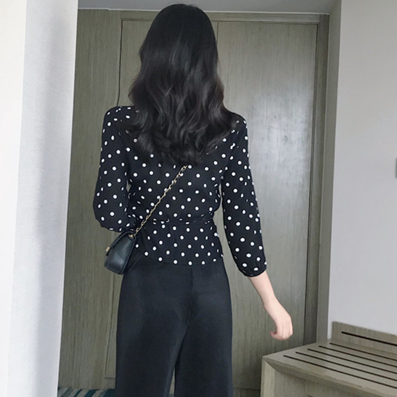 襯衣女夏季新款韓版女裝交叉v領七分袖波點襯衫系帶修身顯瘦上衣