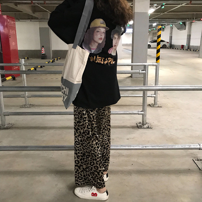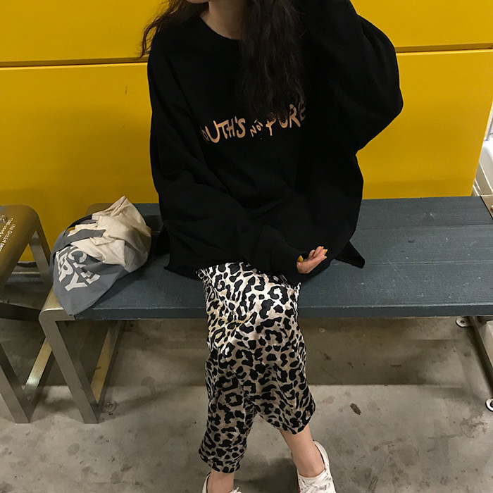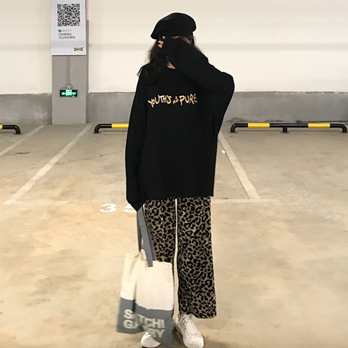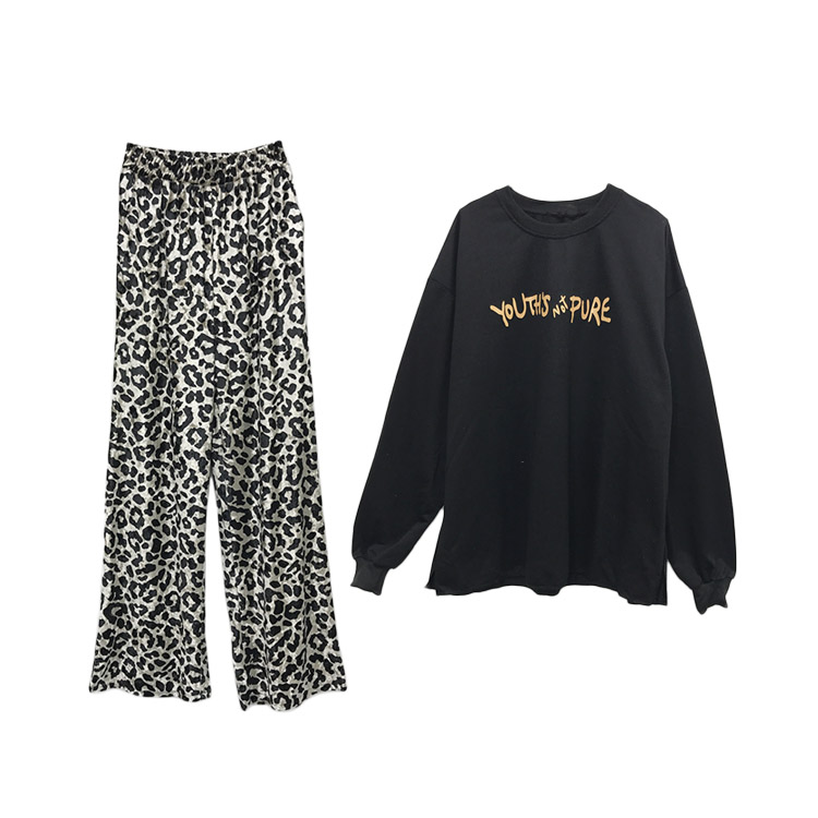 秋裝女2018新款套裝字母印花長袖寬松衛衣+豹紋高腰寬松闊腿長褲