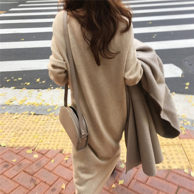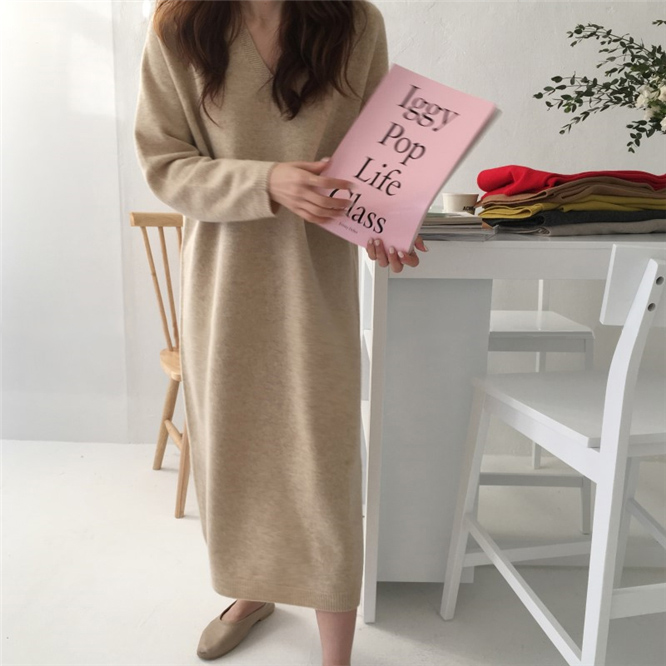 chic早秋毛衣慵懶風針織衫韓版氣質V領中長款寬松針織打底連衣裙