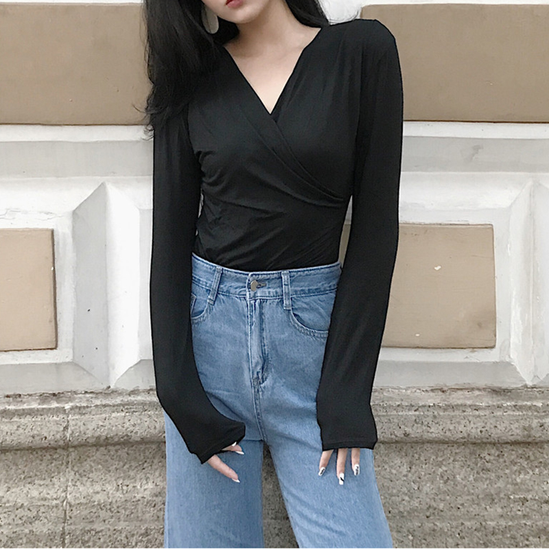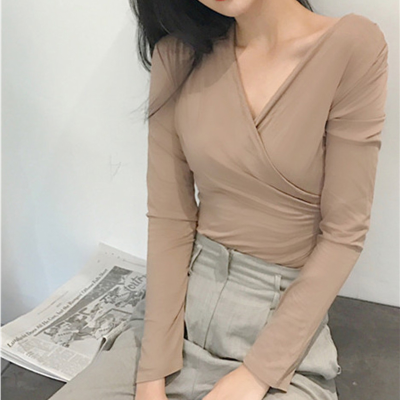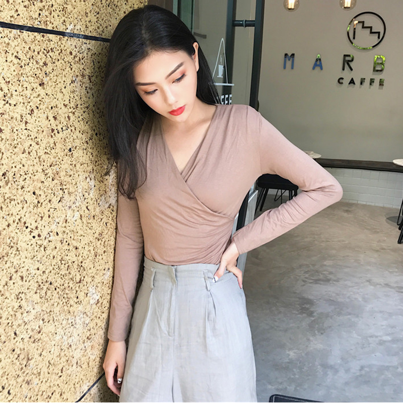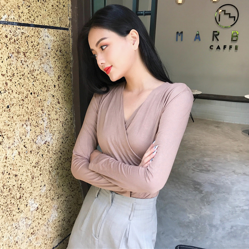 復古港味上衣新款氣質交叉深V領長袖T恤女春秋韓版修身顯瘦打底衫