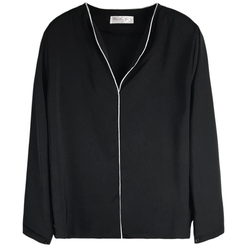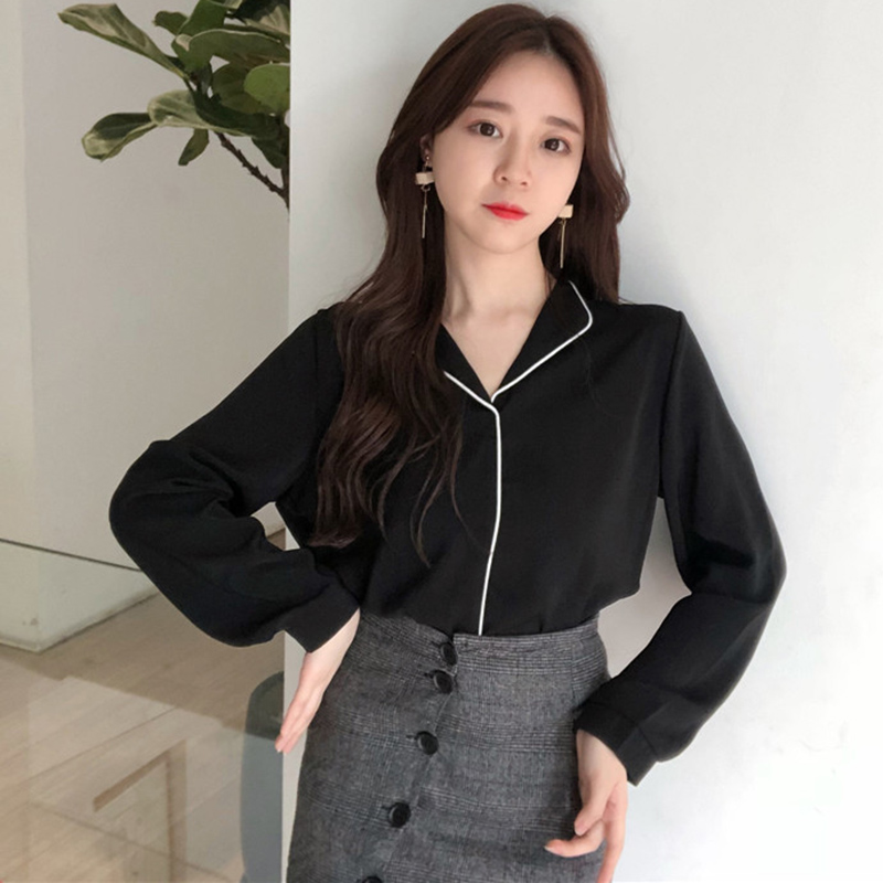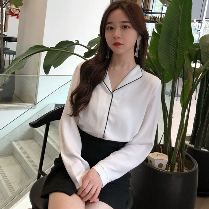 拼色V領雪紡白襯衫早秋女2018新款韓版簡約氣質修身防曬長袖上衣